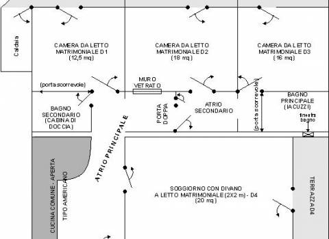 - appartamento 4 localimolto confortevoli con 4 stanze composto da:3 camere da letto matrimonialie soggiorno, 2 bagni ( vasca jacuzzi + cabina doccia/sauna ), cucina comune - aperta, 4 terrazze separate per ciascuna camera da letto, 2 corridoi ( principale con cucina e secondario );